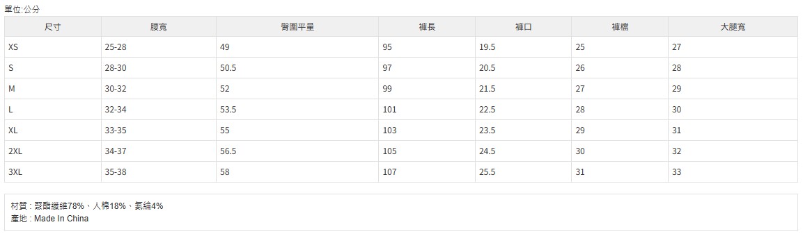 材質 : 78%聚酯纖維 18%人棉 4%氨綸