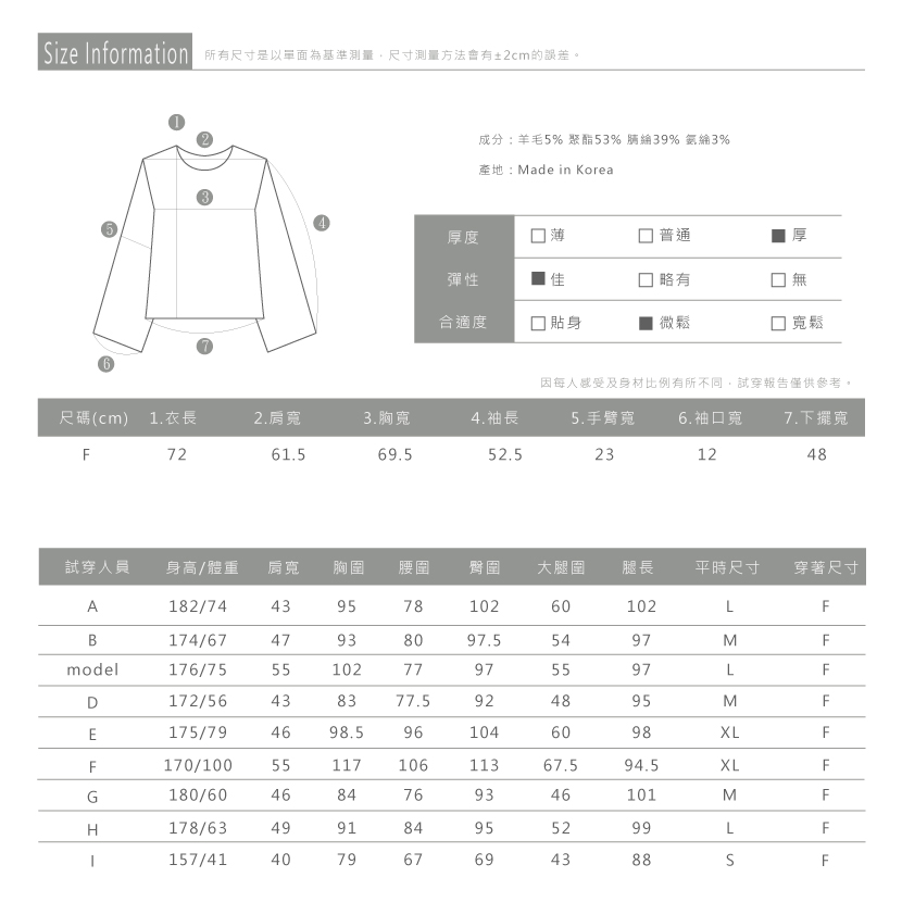 材質 : 羊毛5% 聚酯53% 腈綸39% 氨綸3%