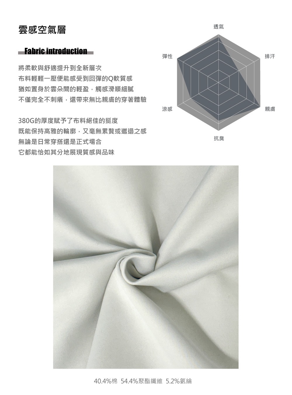 材質 : 40.4%棉 / 54.4%聚酯纖維 / 5.2%氨綸
